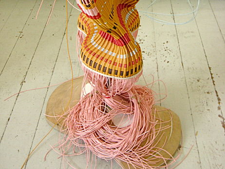 Die Skulpturen von Susanne Thiemann bestehen aus dünnen Plastikschläuchen in monochromen Farben, bunten Elektrokabeln genauso wie dicken Streifen aus zerfetzten Autoreifen. Fundsachen und neuwertige Restbestände von im Überfluss produzierten, schwer verrottbaren Produkten. Material, das viele Assoziationen auslöst, weil wir fast täglich mit ihm umgehen und es benutzen.