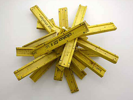 Die meisten großformatigen Skulpturen von Kai Richter sind ortsspezifische und temporäre Installationen, Eingriffe in vorhandene Raumsituationen. Eine ganze Reihe skulptural-architektonischer Grundthemen wird mit dieser einfachen Installation angeschlagen: Stütze und Last, Raum und Raumteilung, Gewicht und Materialwirkung.