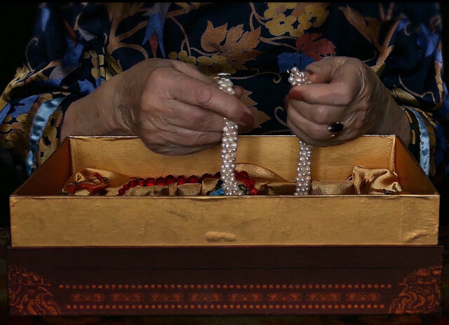 Eine alte Dame nimmt Schmuck aus einer Schatulle. Nach und nach kommen Ringe, Halsketten, Perlen, Broschen, Armbänder und Uhren zum Vorschein. Sie berührt und untersucht jedes Stück, versucht, einige der Dinge anzulegen. Diese taktile und visuelle Untersuchung kann in ihrem Gedächtnis Ereignisse und Gefühle hervorrufen, die mit jedem Stück verbunden sind. In manchen Fällen tut es das, in anderen vielleicht schon nicht mehr.