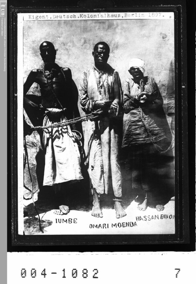 Einer dieser Gegenstände ist ein durch einen deutschen Kolonialoffizier nach Berlin gebrachter Messingteller. Er wurde in Berlin museal fälschlicherweise als „gongartiges Musikinstrument aus Messing mit anscheinend sinnlosen Zauberformeln in arabischer Schrift“ verzeichnet. Tatsächlich enthält die eingravierte Inschrift ein in arabischer Schrift verfaßtes Gebet aus dem Koran, das zum Widerstand gegen die koloniale Fremdherrschaft auffordert. Der ehemalige Besitzer des Tellers, Hassan bin Omari, wurde 1895 von den Deutschen mit einer Reihe anderer Aufständischer hingerichtet.