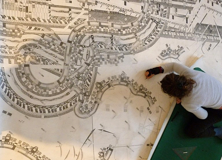 Seit 2018 arbeitet sie jeweils über einen Zeitraum von mehreren Monaten an einer dieser großen Zeichnungen. Dabei diktiert die mehrere Quadratmeter messende Fläche des Bildträgers den Arbeitsprozess.