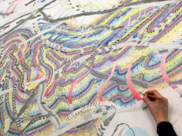 Die Abläufe geben Prozesse wieder, zeigen Entwicklungen, Wiederholungen, Veränderungen und Zustände von Festem und Bewegtem. Mich interessiert diese Simultanität. Der Zeichenprozess ist eine intensive körperliche Erfahrung die zwischen Rausch, Kontrolle, bewusstem und unbewusstem Zustand wechselt.