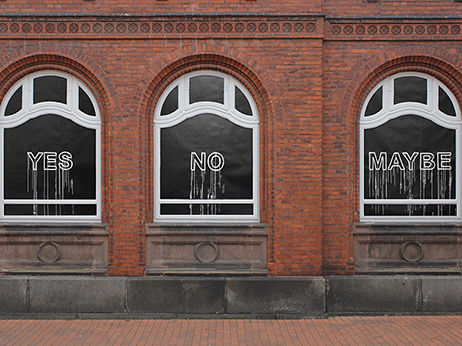 Karima Klasen: „Meine Arbeit beschäftigt sich mit Malerei im erweiterten Feld. Der öffentliche Raum, die künstlerische Arbeit außerhalb des Ateliers eröffnet unvorhergesehene Wechselwirkungen die häufig eine politische Ebene und Fragen zum Kontext aufwerfen. Ich beziehe mich in der Installation YES NO MAYBE auf eine vorhandene Struktur die sowohl räumlich als auch inhaltlich als mein Kommentar zur derzeitigen Situation im Künstlerhaus Eckernförde Stellung bezieht.“